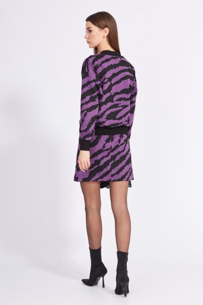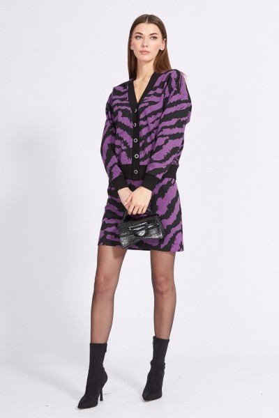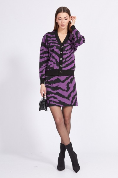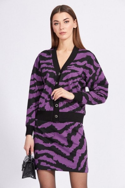 Комплект: кардиган + юбка. Комплект выполнен из трикотажного полотна с геометричным принтом. Кардиган О-образного силуэта, длиной выше линии бедер. Застежка спереди центральная бортовая на пуговицы. Спинка цельная. Горловина спинки и борт выполнен из довяза. Плечевой шов спущен. Рукав рубашечного покроя, одношовный. Низ рукава и низ кардигана выполнены из довяза. Юбка прямого силуэта, на притачном поясе, длиной выше линии колена. Застежка в левом боковом шве на потайную молнию и пуговицу.