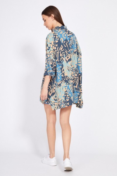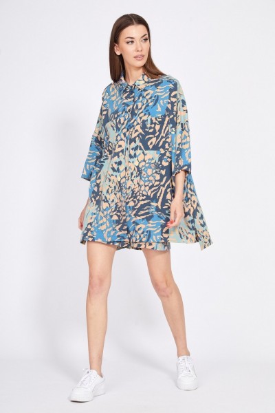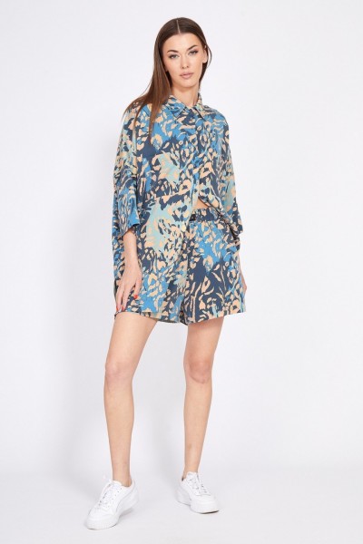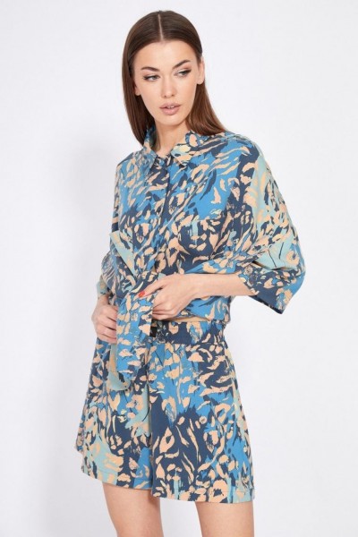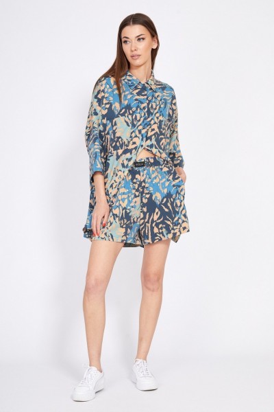 Комплект: блузка + шорты. Комплект выполнен из плательной ткани. Блузка прямого силуэта, покроя оверсайз, длиной ниже линии бедер. Спереди накладные нагрудные карманы и центральная застежка на пуговицы. Спинка цельная, длиннее переда. Воротник стояче-отложной. Плечевой шов спущен. Рукав рубашечного покроя, длиной ниже линии локтя. В боковых швах разрезы. Шорты на притачном поясе с эластичной тесьмой, длиной до середины бедра. В боковых швах карманы. Шорты декорированы нашивкой спереди по поясу.