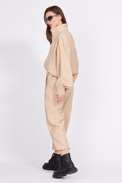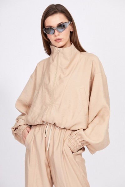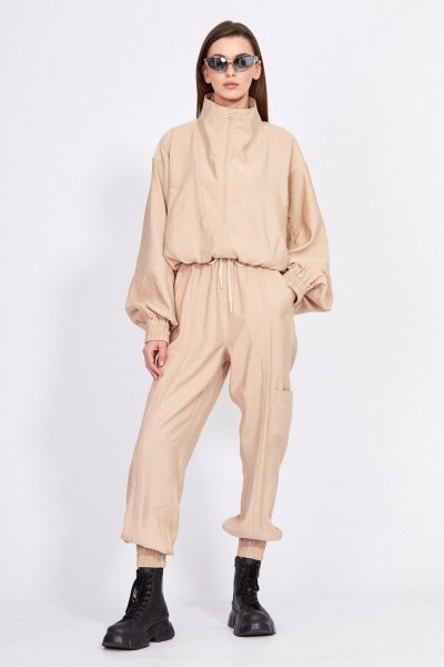 Комплект: куртка + брюки. Комплект выполнен из однотонного гладкокрашенного полотна с крэш-эффекто Куртка покроя кимоно, на притачном поясе с эластичной тесьмой. Застежка спереди на молнию. Спереди прорезные карманы с листочкой и кокетка, переходящая в воротник-стойку. Рукав цельнокроенный, с горизонтальными и вертикальными подрезами, на притачной манжете с эластичной тесьмой. Брюки свободного покроя, на цельнокроенном поясе с эластичной тесьмой, заужены к низу. В пояс вставлен шнур. Спереди вертикальные рельефы и прорезные карманы с листочкой. Низ брюк на манжете с эластичной тесьмой. По боковому шву накладные карманы.
