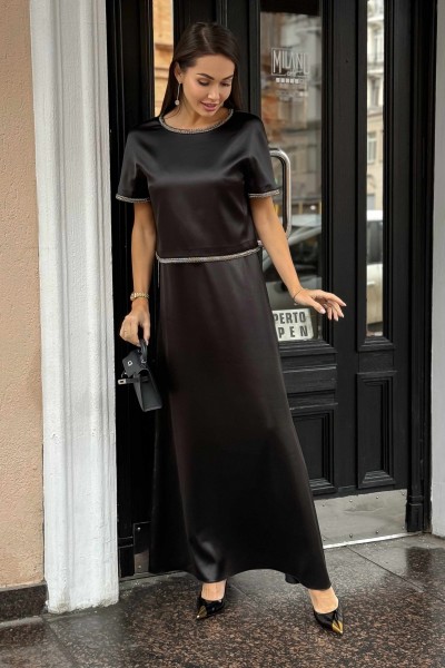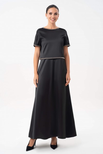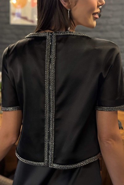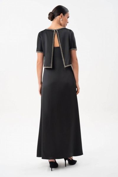 Низ переда, спинки и рукавов, горловина, застежка спинки вдоль молнии декорированы отделочной тесьмой из сетки с нашивными бусинами (размер и цвет фурнитуры может незначительно отличаться от фото).