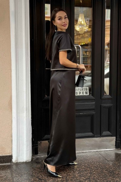 Нарядный женский костюм с платьем от брендов URS — это утончённый праздничный комплект, созданный для тех, кто выбирает изысканность, благородство и проверенную временем классику. Такой вечерний костюм прекрасно вписывается в атмосферу торжества, подчеркивает женственность и обеспечивает комфорт на протяжении всего события. Костюм женский, состоящий из блузона и платья, выполненных из плательной атласной ткани, нарядный.