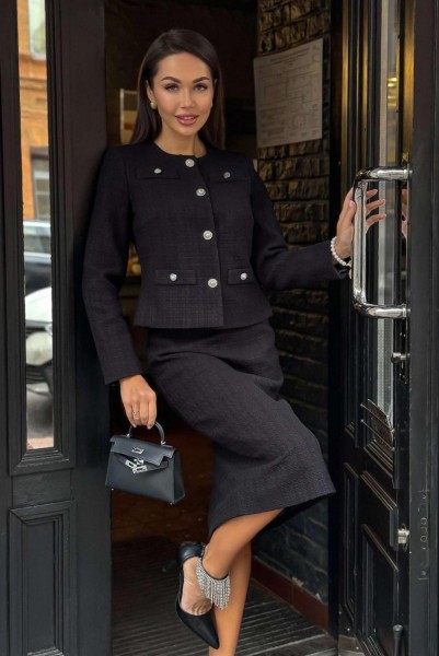 Твидовый костюм с юбкой — это воплощение элегантности и сдержанной роскоши. Юбка и жакет, выполненные в классическом дизайне, придают образу женственности и изящества. Этот костюм станет незаменимым элементом гардероба современной женщины, ценящей комфорт и стиль.