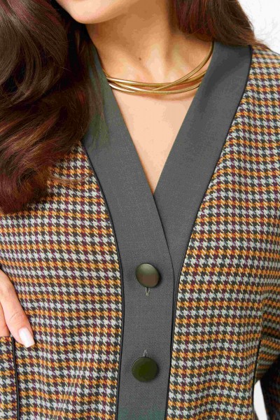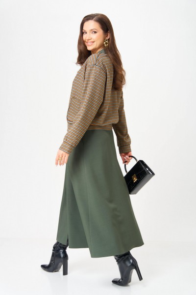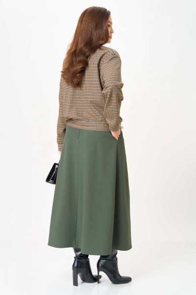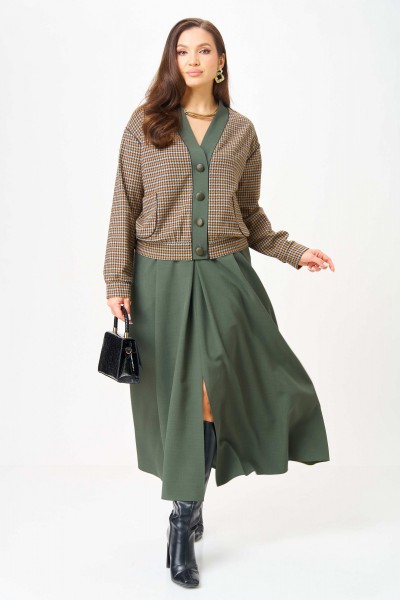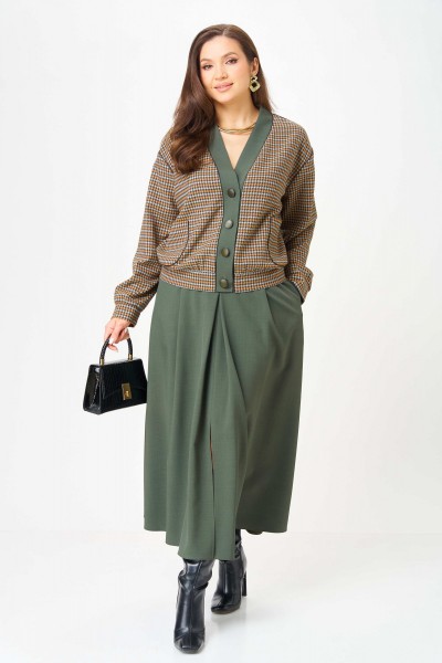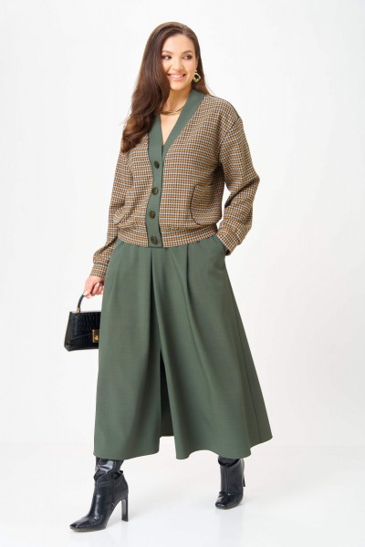 Этот костюм — воплощение интеллектуальной элегантности. Мягкий светло-серый кардиган с коричневыми кантами и крупными пуговицами создаёт образ уютного шарма. V-образный вырез визуально вытягивает шею, а контрастные детали подчёркивают чёткость линий. Рукав на спущенной плойме с манжетой по низу. По перду накладные карманы с декоративной нашивкой. Коричневая юбка миди с глубокими встречными складками и разрезом по переду добавляет образу женственности. В боковых швах карманы. Юбка на подкладке. Для максимально комфортной посадки по бокам пояса вставлена эластичная резинка. Сочетание мягкого верха и строгого низа создаёт баланс между комфортом и аккуратностью, делая комплект универсальным для офиса, повседневных выходов и стильных деловых встреч.