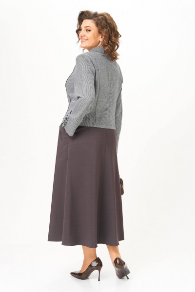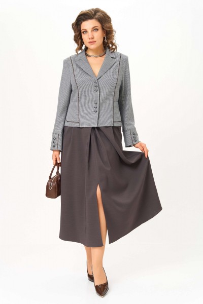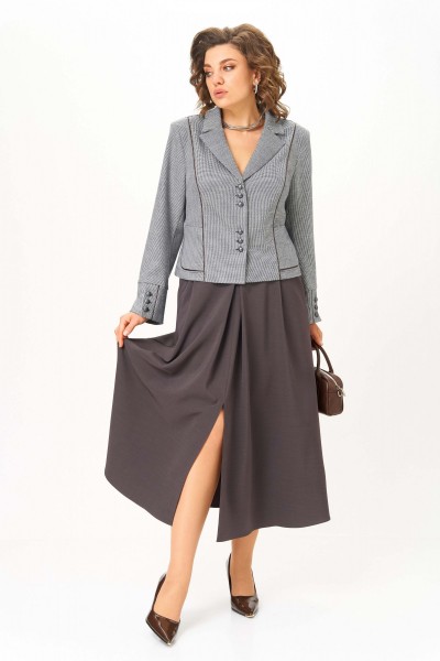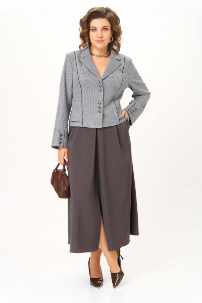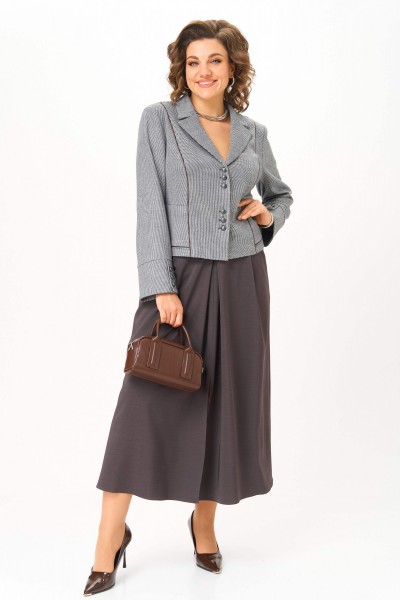 Костюм построен на контрасте фактур и цветов: строгая чёрно-белая «гусиная лапка» + глубокий графитово-коричневый низ. Коричневая отстрочка-кант на жакете выступает связующим звеном между верхом и низом, создавая единую цветовую историю. Рельефы и приталенный силуэт делают фигуру визуально стройнее и выше. Рукав втачной двухшовный с широкой манжетой и пуговицами. Юбка на подкладке. Для максимально комфортной посадки по бокам пояса вставлена эластичная резинка. Сочетание мягкого верха и строгого низа создаёт баланс между комфортом и аккуратностью, делая комплект универсальным для офиса, повседневных выходов и стильных деловых встреч.