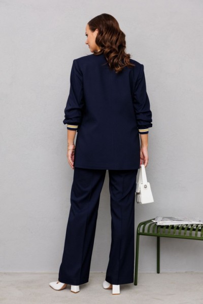 Жакет полуприлегающего силуэта, выполнен из костюмной ткани (не тянется) с отделкой из довяза на подкладке. Перед с нагрудными вытачками и настрочными клапанами. Застежка центральная на петли-пуговицы. Горловина оформлена воротником пиджачного типа с лацканом. Спинка со средним швом. Рукава втачные, двухшовные с мягкими складками и манжетой из довяза.