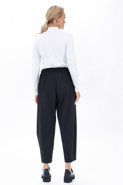 Брюки типа «банан», с притачным поясом на резинке, с имитацией застёжки типа «гульфик». С переходящими на перед фигурными боковыми швами, от линии низа по боковым конструктивные выточки. Низ обработан обтачкой. Передние части с косыми боковыми карманами и талевыми выточками.