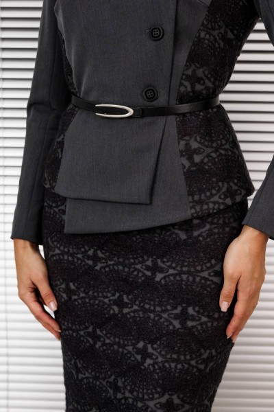 Неподражаемый образ позволяет создать костюм, состоящий из жакета и юбки расшитой махеровой нитью. Жакет полуприлегающего силуэта со смещенной асимметричной бортовой застежкой на три пуговицы. Жакет отрезной по талии с фигурными рельефами и средним швом по спинке. Рукав втачной двухшовный. Воротник пиджачного типа с отрезными лацканами. Юбка прямая, слегка зауженная к низу, на притачном поясе с резинкой и со шлицей в среднем шве. Жакет и юбка на подкладке. Практичный и элегантный костюм, в котором удачно сочетается разные материалы - это оптимальное решение для офиса. Пояс входит в комплект.