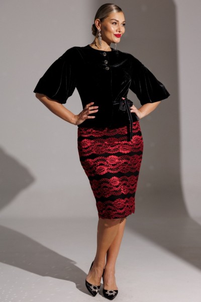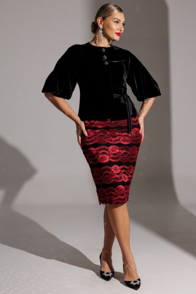 Нарядный комплект, состоящий из жакета и юбки. Комфортный жакет из велюра полуприлегающего силуэта с центральной комбинированной застежкой на 3 пуговицы и 3 потайные кнопки. Спинка со средним швом и талиевыми вытачками. По переду также талиевые вытачки. Горловина округлой формы. Объемные фантазийные рукава со складками смягчают строгий силуэт. Декором выступают декоративные пуговицы и завязка на талии. Шикарная юбка из сетки с серебряным напылением заужена к низу. Молния и шлица в среднем шве. По талии кокетки. Костюм на подкладке. длина спинки жакета: 54 см длина юбки: 65 см длина рукава от горловины: 55 см