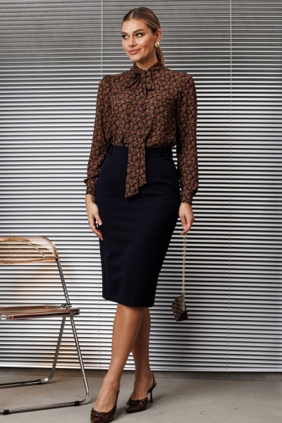Трехпредметный костюм с приталенным жакетом в модной цветовой гамме – яркий экземпляр для Вашей коллекции. Жакет с рельефами. По переду и спинке на полочках обработаны карманы с клапаном. Рукав втачной, двухшовный. Воротник стойка. Застежка на петли-пуговицы. Блуза прямого силуэта, в боковых швах с разрезами, по переду с нагрудной вытачкой. Воротник-стойка, переходящий в бант. Рукав втачной, одношовный, снизу на манжете. Сверху по окату со сборкой. Юбка прямая, зауженная к низу, на притачном поясе, по бокам с резинкой.