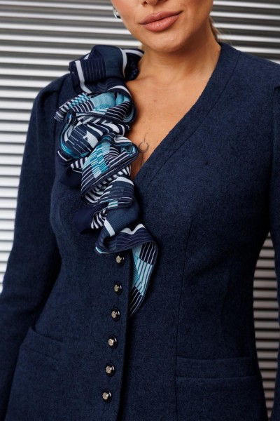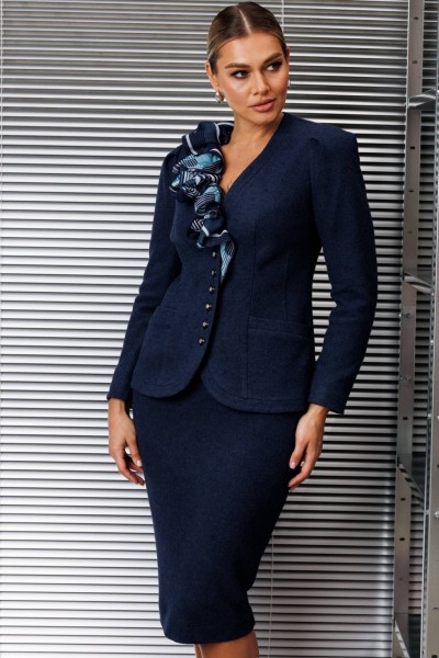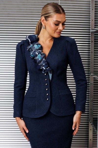 Что делает образ женственным и романтичным? Конечно же силуэты, подчеркивающие женскую фигуру, а также такие ткани как органза, шелк, шифон. Дизайнеры бренда "МОДА-ЮРС" предлагают Вам новинку - жакет из шерсти со съемным шарфом . Данная модель смотрится очень стильно и женственно. Такой жакет может стать основой многих образов. Смело сочетайте его со своими праздничными и деловыми блузами. Жакет полуприлегающего силуэта. По переду и спинке с талиевыми вытачками, на полочках обработаны карманы. Спинка со средним швом. Рукава втачные, двухшовные, сверху по окату со складками. Застежка центральная на петли-пуговицы. Жакет декорирован съемным шарфом, нижняя часть которого застегивается на петли-пуговицы. Юбка прямая, зауженная к низу, сверху на притачном поясе, по бокам с резинками. Застежка на тесьму-молнию в среднем шве, который переходит в шлицу.