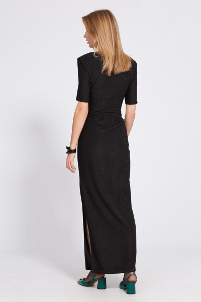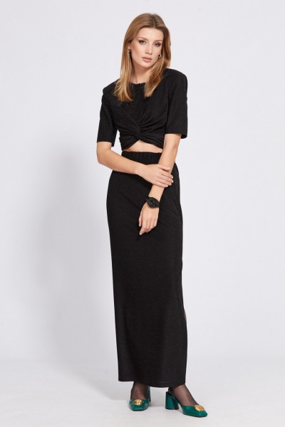 Комплект: блузка + юбка. Комплект выполнен из трикотажного полотна с люрексом. Блузка приталенного силуэта длиной до линии талии. Спереди средний шов с застежкой на потайную молнию, перекрут со сборками по боковыми швам. Спинка цельная. Рукав втачной одношовный, длиной до линии локтя. Блузка с плечевыми накладками, на подкладке. Юбка длиной макси, зауженная к низу. Переднее и заднее полотнища цельные. В левом боковом шве разрез. Юбка на цельнокроеном поясе. Юбка без подкладки.