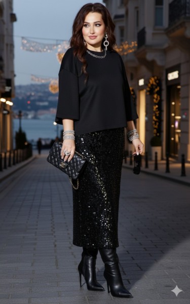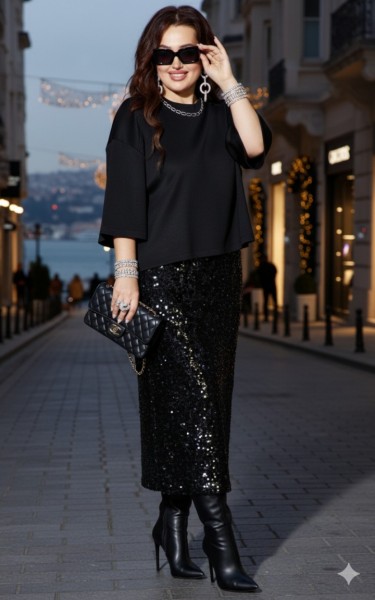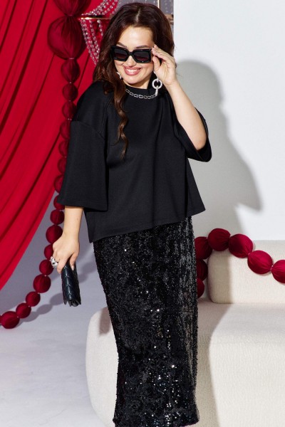 Черный женский комплект состоит из однотонной блузы и юбки миди, украшенной фактурной черной пайеткой. Общий контур ансамбля сдержан и элегантен: чистый черный цвет без лишних акцентов, но с выразительным игровым эффектом за счет текстур и бликов пайетки. Материалы гармонируют между собой — мягкость однотонной блузки контрастирует с фактурной, зеркальной поверхностью юбки, создавая ощущение глубины и лаконичной роскоши. Этот комплект подходит для вечерних мероприятий, деловых встреч и торжественных приемов, где ценят стиль, сдержанность и уверенность без лишних деталей. Блуза обнимает фигуру ровным, спокойным материалом, уютно садится по линии плеч и груди, создавая ощущение мягкости и уверенности. По текстуре она гладкая на ощупь, с легким теплом и бархатистым блеском, который подчеркивает тонкую фактуру материала. Блуза оверсайз силуэта, с округлой формой горловины, декоративными кокетками по переду. Линия плеча в блузе спущенная, рукав втачной, широкий, длиной ¾. Спинка в блузе со средним швом, вырезом капелькой с застёжкой на петлю-пуговицу, декоративными кокетками. Низ в блузе ассиметричный. В качестве дополнительного декоративного элемента в блузе по горловине отделка в виде декоративной тесьмы. Юбка длиной миди держит внимание за счет ткани, украшеной в густую, слегка крупную фактурную пайетку. Юбка прямого силуэта с притачным поясом со вставкой эластичной тесьмы-резинки в бочках. В среднем шве заднего полотнища юбки застёжка на молнию и пуговицу в поясе.