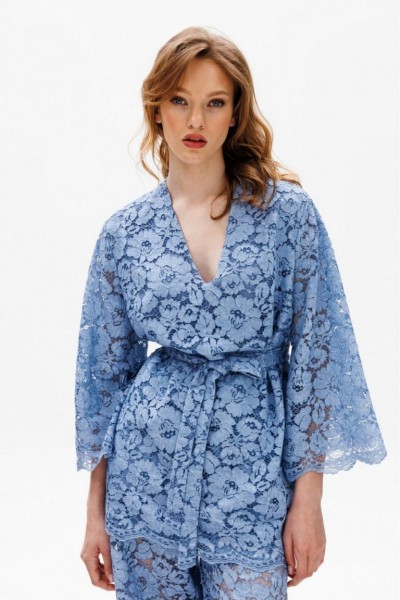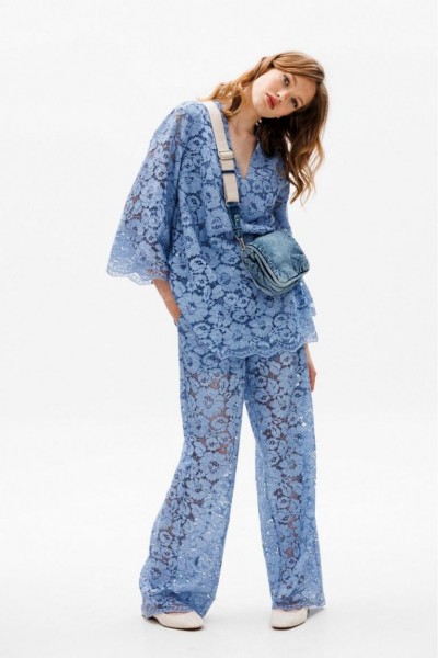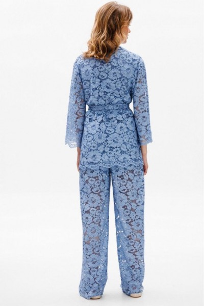 Комплект: блузка + брюки. Комплект выполнен из гипюра. Блузка прямого силуэта длиной ниже линии бедер. Горловина переда V-образной формы. Плечевой шов спущен. Рукав рубашечного покроя, одношовный, длиной 4/5, расширенный к низу. Низ рукавов и низ блузки с цельнокроенными фестонами. Перед и спинка на отлетной по низу подкладке. Брюки прямого силуэта на притачном поясе с эластичной тесьмой. Спереди обработаны боковые карманы, с наклонным входоБрюки на подкладке в виде шорт. Пояс входит в комплект.