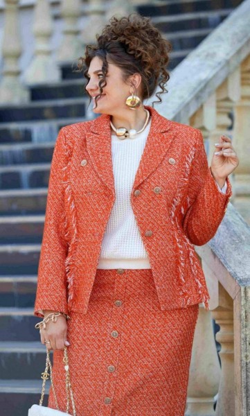 Невероятно яркий двух- предметный костюм для Вашего неповторимого образа выполнен из приятной на ощупь ткани помогая создать стильный образ, который будет уместен как для торжественных случаев, так и для деловых встреч. Жакет полуприлегающего силуэта на подкладке, с двубортной застёжкой на петли пуговицы по краю борта. Воротник пиджачного типа с лацканами. По переду жакета рельефы со вставками декоративной бахромы из основной ткани. Спинка с средним швом и декоративными рельефами. Рукав втачной, длинный, двухшовный. Юбка прямого силуэта длины «миди» с планкой, с имитацией застёжки на пуговицы по переду, переходящей в шлицу. Пояс в юбке притачной с вставкой эластичной тесьмы-резинки в бочка. По переду юбки наклонные карманы. По спинке в среднем шве застёжка на потайную тесьму-молнию и талиевые вытачки. Юбка на подкладке. Обращаем Ваше внимание, что фурнитура может незначительно отличаться от фотографии.