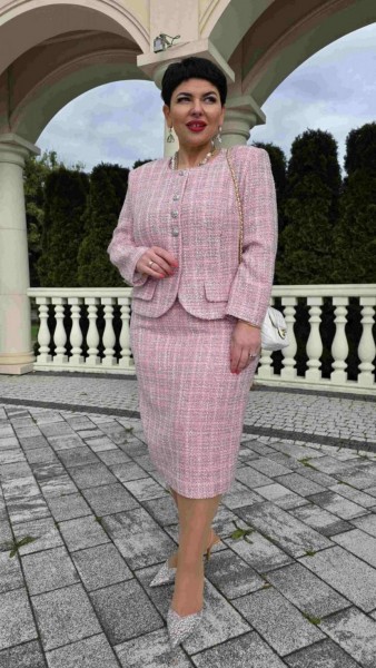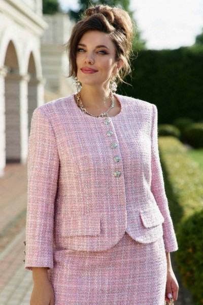 Костюм женский, состоящий из укороченного жакета и юбки-карандаш. Основа ткани — роскошный твид, в который искусно вплетена тонкая люрексовая нить, придающая полотну деликатное мерцание и благородный блеск. Жакет прямого силуэта с округлой формой горловины и линией борта. Застёжка на декоративные петли пуговицы по борту и потайные кнопки от низа жакета. По переду жакета фигурные рельефы и декоративные клапана карманов. Спинка с талиевыми вытачками. Рукав втачной, двухшовный, длинный с отделкой из декоративных пуговиц в шве. Жакет на подкладке. Юбка прямого силуэта, удлинённая, с талиевыми вытачками. Пояс в юбке притачной со вставкой эластичной тесьмы в боках. В среднем шве спинки юбки застёжка на потайную тесьму-молнию и пуговицу в поясе. По низу юбки отлетная шлица. Юбка на подкладке. Обращаем Ваше внимание, что фурнитура может незначительно отличаться от фото.