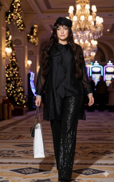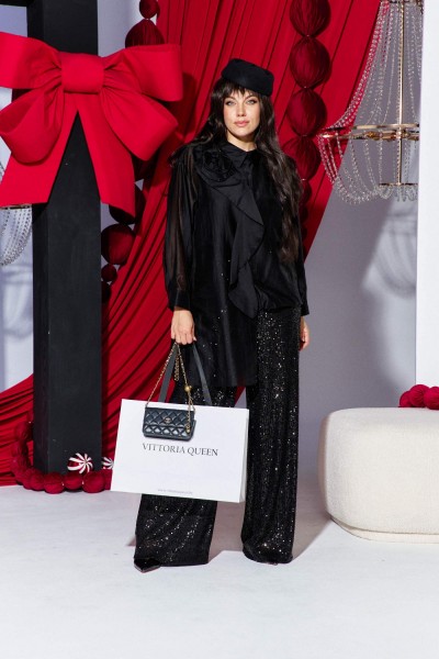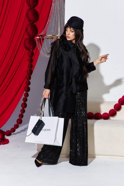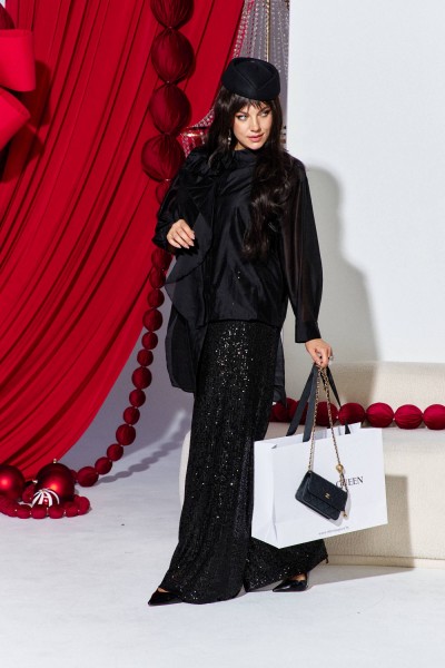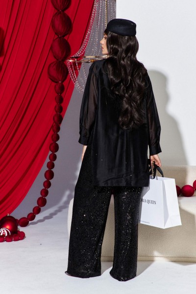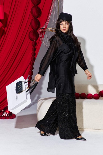 Комплект женский боючный, состоящий из блузки, блузы и брюк. Это нарядный и стильный комплект, который идеально подходит для вечернего мероприятия. Брюки выполнены из плотной ткани, полностью расшитой чёрными пайетками, которые создают эффект яркого мерцания при движении. Их свободный крой и высокая посадка на талии обеспечивают комфорт и создают современный, элегантный силуэт. Блузка из полупрозрачной чёрной вуали имеет свободный, струящийся крой. Её главным акцентом является крупный объёмный цветок, расположенный на плече, и декоративная драпировка. Под блузкой надет топ чёрного цвета, который скрывает тело и придаёт образу завершённость. Блузка свободного силуэта, с центральной застёжкой на петли-пуговицы по планке, воротником рубашечного типа. Линия плеча в блузке спущенная. Рукав втачной, длинный с заложенной складкой по низу и притачной манжетой, застёгивающейся на петли-пуговицы. Спинка с отрезной кокеткой. Низа в блузке ассиметричный, в боковом шве высокий разрез. Главным акцентом является декоративный элемент в виде розы. Блуза прямого силуэта с округлой формой горловины и нагрудными вытачками по полочке. В боковых швах разрезы. Брюки прямого силуэта, пояс цельнокроенный, на эластичной тесьме-резинке. Брюки на подкладке.