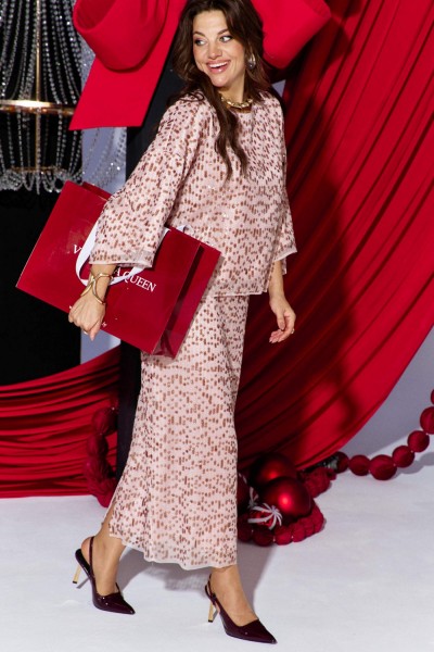 Изящный костюм состоит из блузы и юбки миди, украшенных крупной пайеткой пудрово-розового оттенка. Совокупность текстур делает акцент на женственности и утонченной роскоши: пудрово-розовый оттенок дарит мягкость и нежность, а крупная пайетка добавляет ансамблю праздничности и солнечного блеска. Пайетки крупной величины рассыпаны по всей поверхности, образуя эффект мягкого мерцания. Это наряд, который подойдет для вечерних мероприятий, светских раутов и торжественных встреч, вызывая восхищение и спокойную уверенность в себе. Блуза свободного силуэта, с округлой линией горловины. Линия плеча в блузе спущенная, рукав втачной, длиной 7/8. Спинка без особенностей. Низ в блузе ассиметричный. Блуза на отлетной подкладке. Юбка прямого силуэта, длины миди с притачным поясом с эластичной тесьмой-резинкой в круговую, что обеспечивает максимально удобную посадку на любой тип фигуры. В среднем шве юбки разрез от низа. Юбка на подкладке.