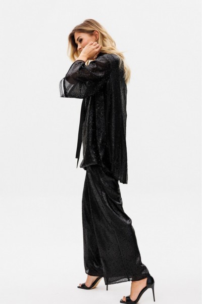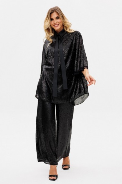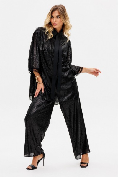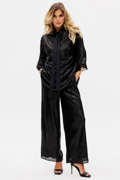 Комплект: блузка+брюки. Комплект выполнен из трикотажного полотна в пайетки. Блузка прямого силуэта, длиной ниже линии бедер. Перед и спинка цельные. Спереди застежка на пуговицы. Стояче-отложной воротник с отрезной стойкой. Плечевой шов удлинен. Рукав рубашечного покроя, одношовный, длиной ниже линии локтя. Низ рукава декорирован тесьмой-кружевом. В комплект входит съемный галстук. Галстук и воротник выполнены из атласа. Низ блузки фигурной формы. Блузка на отлетной по низу подкладке. Брюки прямого силуэта, длиной до линии щиколотки, на притачном поясе с эластичной тесьмой. В боковых швах карманы. Брюки на отлетной по низу подкладке.