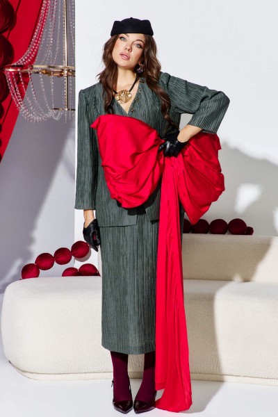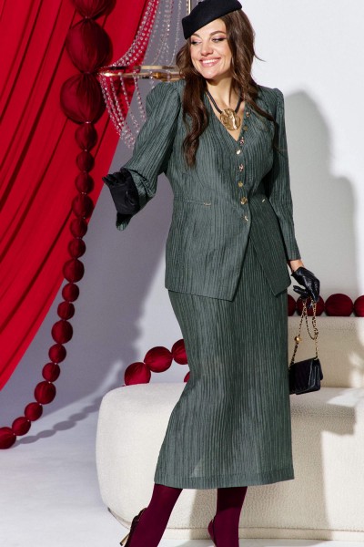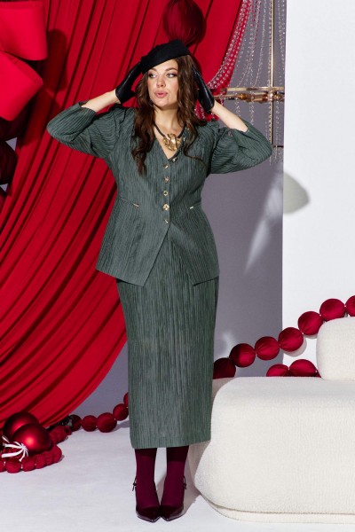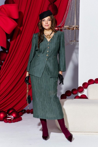 Костюм женский юбочный, состоящий из жакета и юбки. Этот феерический костюм соответствует сразу нескольким трендам! Стильный костюм сочетает в себе нарядность и в тоже время деловую элегантность. Ткань с эффектом «гофре» – хит сезона! Это структурированная ткань с жатым эффектом, который создаётся разным натяжением нитей в процессе ткачества. Жакет прилегающего силуэта, однобортный, с акцентом на ровную линию плеч, плавным V-образным вырезом горловины, застёжкой на декоративные петли-пуговицы по краю борта. По переду жакета вертикальные рельефы, декоративные складки от плеча, и имитация листочек кармана переходящих на спинку жакета. Спинка без особенностей. Рукав в жакете втачной, длинный, со сборкой по окату. Главным декоративным акцентом, который приковывает взгляд является россыпь пуговиц по борту, разных размеров и фактур. Это несомненно добавляет образу экстравагантность. Жакет на подкладке. Юбка прямого силуэта, длины «миди», с притачным поясом со вставкой эластичной тесьмы-резинки в бочках. В среднем шве юбки застёжка на потайную тесьму - молнию и пуговицу в поясе, с высоким разрезом от низа. Юбка на подкладке.