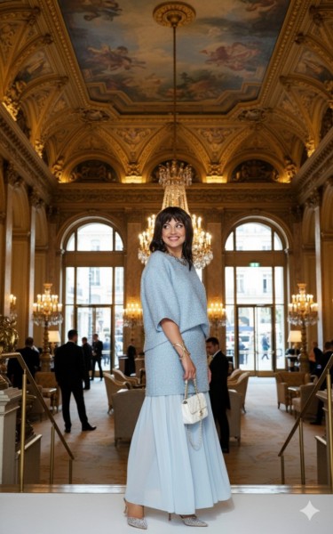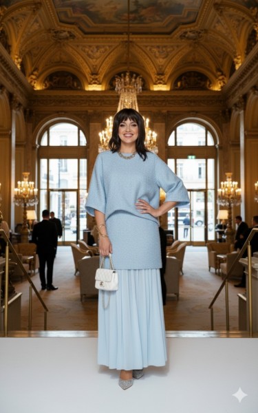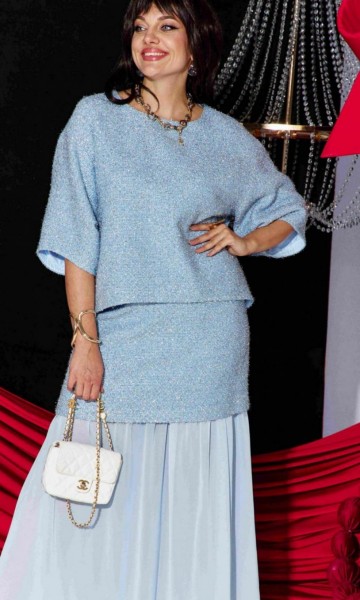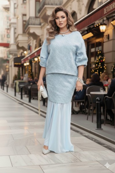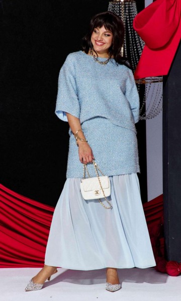 Это стильный и современный юбочный костюм, созданный для особого случая. Он состоит из трёх частей: блузы, верхней и нижней юбки. Основу ткани составляет роскошный твид голубого цвета с металлическим блеском, в который искусно вплетена деликатная люрексовая нить, придающая полотну благородное мерцание. Он не только подчеркивает достоинства фигуры, но и дарит ощущение комфорта и роскоши. Блуза свободного силуэта, выполненная из плотной, фактурной ткани с серебристым блеском. Её простой крой с широкими рукавами создаёт расслабленный силуэт. Горловина в блузе округлой формы, по переду нагрудные вытачки. Спинка без особенностей. Рукав длиной ¾, широкий, фигурной формы с застроченной складкой. Низ в блузе ассиметричный. Юбка представляет собой многослойную конструкцию: верхний слой выполнен из той же блестящей ткани, что и блуза, и имеет прямой силуэт мини-длины. Нижний слой — это длинная, струящаяся юбка-макси из полупрозрачного, лёгкого шифона серого цвета. Такое сочетание фактур и длин создаёт интересный и динамичный образ. Верхняя юбка длины мини, прямого силуэта с притачным поясом со вставкой эластичной тесьмы- резинки в бочках. В среднем шве юбки застёжка на потайную тесьму-молнию и пуговицу в поясе. Юбка на подкладке. Нижняя юбка длины миди, со сборкой на резинку по верхнему срезу, с притачным воланом со сборкой от подреза.