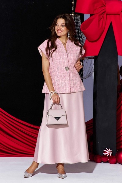 Безумно красивый и стильный плательный комплект в элегантном сочетании жилета в стиле «шанель» и однотонного платья-комбинации. Невероятно элегантный комплект станет отличным вариантом для торжественных мероприятий. Комплект женский двух предметный, состоящий из жилета и платья. Жилет удлинённый, прилегающего силуэта, с фигурной линией борта и застёжкой на декоративную кнопку по краю борта. По переду жилета талиевые вытачки, горловина завышенная — с цельнокроеной стойкой. Линия плеча в жилете увеличенная. Спинка со средним швом переходящим в отлетную шлицу от низа и талиевые вытачки. Основа ткани — роскошный твид, в который искусно вплетена тонкая люрексовая нить, придающая полотну деликатное мерцание и благородный блеск. Жилет на подкладке. Платье силуэта «рыбка» длины миди на регулируемых бретелях с драпировкой горловины – «качели». По спинке платья талиевые вытачки.
