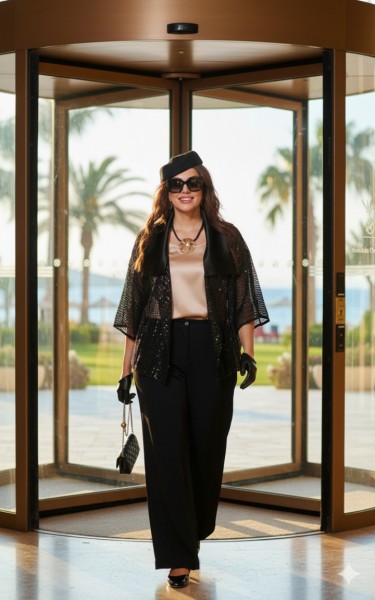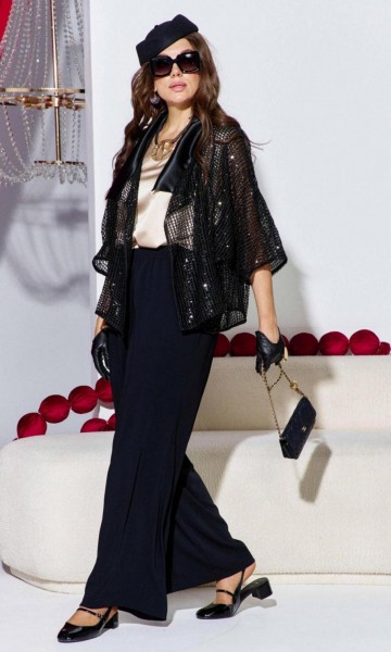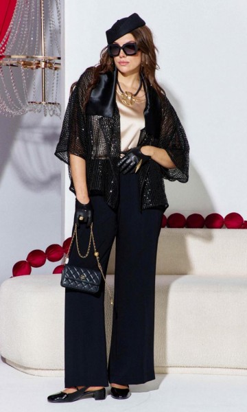 Комплект женский брючный, состоящий из жакета, блузы и брюк. Если Вы ищете идеальное сочетание стиля и комфорта, вот идеальный выбор. Мы специально подобрали качественную и тактильно приятную ткань, которая хорошо держит свою форму, создавая ощущение легкости и свободы движения. Стильный комплект - лучший выбор для тех, кто не боится самовыражаться и приковывать к себе взгляды окружающих. Оригинальный асимметричный крой, помноженный на пластические свойства ткани подчеркнет все, что нужно подчеркнуть, и скроет все, что нужно скрыть. Жакет продолжает линию плеча и свободно свисает до середины бедра, образуя мягкую, расслабленную форму. Это не просто вещь, а диалог материалов: матовая глубина сетки и искрящийся блеск пайеток соединяются с атласным воротнико, создавая ансамбль, который легко адаптируется под вечерний выход. Жакет «оверсайз» силуэта с ассиметричной линией борта, отложным воротником из отделочной ткани. Линия плеча в жакете спущенная. Рукав втачной, длиной ¾. Спинка без особенностей. Жакет на подкладке. Блуза в благородном золотом оттенке, который гармонично сочетается с насыщенным чёрным цветом комплекта. Блуза прямого силуэта с округлой формой горловины и нагрудными вытачками по полочке. Спинка без особенностей. Низ в блузе фигурной формы. Брюки прямого силуэта, длинные. Пояс в брюках притачной на эластичной тесьме-резинке. По переду брюк прорезные карманы.