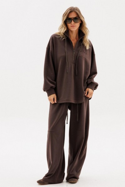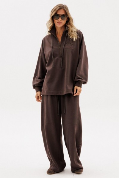 Комплект: джемпер+брюки. Комплект выполнен из трикотажного полотна. Джемпер прямого силуэта, покроя "oversize" длиной до линии бедер. Спереди застежка на молнию. Воротник-стойка. Плечевой шов удлинен. Рукав рубашечного покроя, одношовный, расширенный и присборенный к низу. Низ рукава на притачной манжете. Низ джемпера на эластичной тесьме с фиксаторами. Джемпер декорирован вышивкой по переду. Брюки прямого силуэта, длиной в пол, на притачном поясе с эластичной тесьмой. Спереди боковые карманы с фигурным входом, петли в поясе, в которые втянут шнур из основной ткани, коленные вытачки, складки. Сзади справа накладной карман.