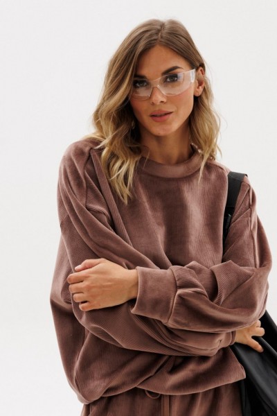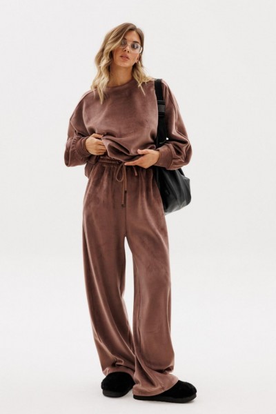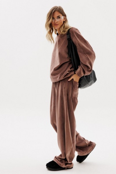 Комплект: джемпер+брюки. Комплект выполнен из двустороннего велюра в мелкий рубчик. Джемпер О-образного силуэта, покроя "oversize", длиной до линии бедер. Перед и спинка цельные. Горловина округлой формы, обработана бейкой. Плечевой шов удлинен. Рукав рубашечного покроя, одношовный. Низ рукава на манжете. Верхняя часть рукава переходит в кокетку переда т спинки и доходит до горловины. По низу джемпера обработан пояс. Пояс, манжеты, верхняя часть рукава и бейка горловины выполнены из основной, но без рубчика. Брюки на притачном поясе с эластичной тесьмой, прямого силуэта, длиной в пол, покроя "oversize". Боковой шов заменен лампасом. В швах лампаса карманы. Сзади накладные карманы. В пояс протянут шнур с наконечниками. По низу брюк втянута эластичная тесьма с фиксаторами. Лампасы и пояс выполнены из основной ткани, но без рубчика.