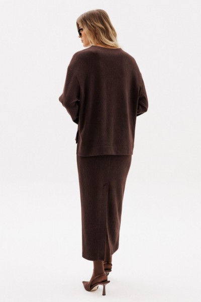 Комплект: джемпер + юбка. Комплект выполнен из трикотажного полотна с рисунком. Джемпер прямого силуэта, длиной до линии бедра. Перед со средним швом. Спинка цельная. Горловина V-образной формы. Плечевой шов спущен. Рукав рубашечного покроя, одношовный. В боковых швах разрезы. Спинка длиннее переда. Юбка слегка заужена к низу, на цельнокроенном поясе с эластичной тесьмой, длиной миди. Юбка без подкладки, сзади шлица в среднем шве.