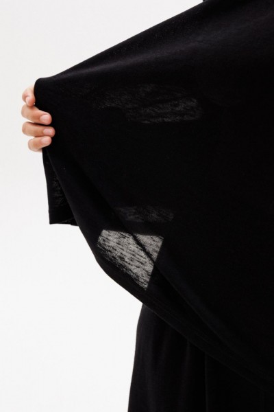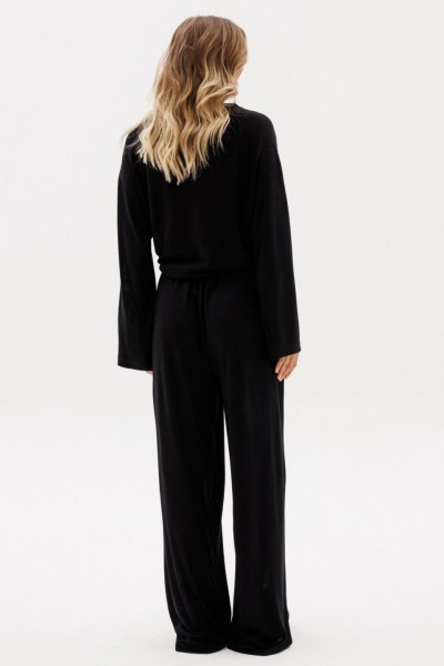 Комплект: джемпер + брюки. Комплект выполнен из трикотажного полотна. Джемпер прямого силуэта, длиной до линии бедра. Перед и спинка цельные. Горловина округлой формы, обработана широкой бейкой. Плечевой шов удлинен. Рукав рубашечного покроя, одношовный. Брюки прямого покроя, длиной в пол, на притачном поясе с эластиной тесьмой.