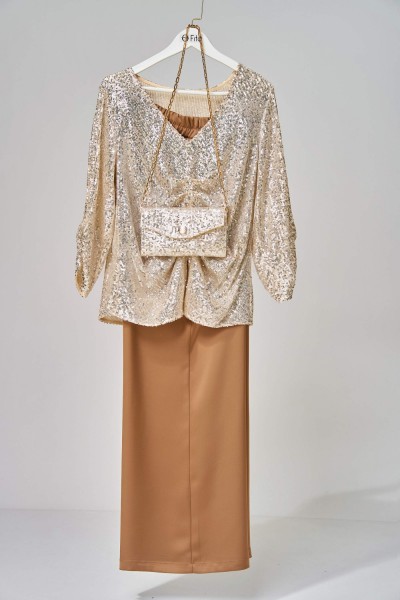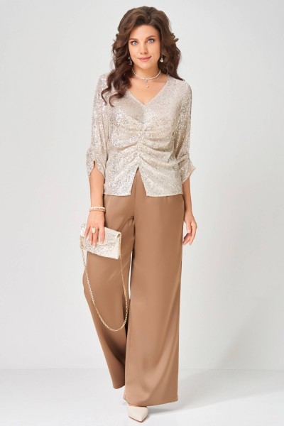 ""Зария"" — сияющий образ для особенных вечеров. Блузка, расшитая пайетками, ловит свет и восхищённые взгляды, а сатиновые брюки добавляют элегантности и свободы движения. Идеальный выбор для новогодней ночи, корпоративов и торжеств, где хочется блистать.