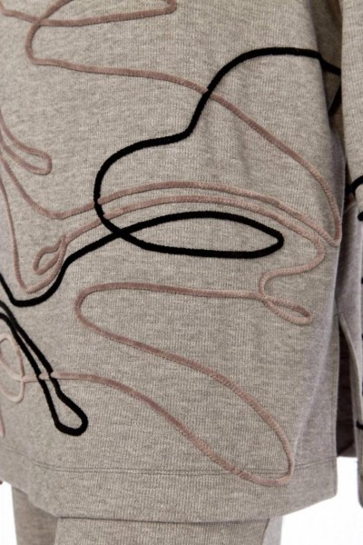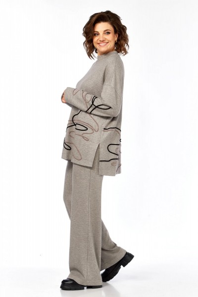 Костюм брючный двухпредметный изготовлен из трикотажного полотна. Состоит из джемпера и брюк. Джемпер свободного кроя. Горловина обработана воротником-стойкой. По переду, спинке и рукаву — вышива шнуром. В боковых швах внизу обработаны разрезы. Рукава спущенные длинные. Брюки прямого силуэта, обработан пояс на резинке. В брюках имеются карманы.