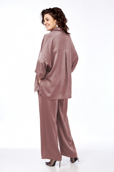 Костюм брючный двухпредметный, выполнен из костюмно-плательной ткани с эффектом легкой мятости. Состоит из блузки и брюк. Блузка свободного силуэта. Воротник стояче-отложной с лацканами переходящими в планку. На спинке кокетка, со встречной складкой. Рукава спущенные. Изделие дополнено съемным декором. Брюки средней посадки, свободного кроя. Пояс притачной на эластичной тесьме. В передних деталях обработаны карманы с подрезным бочком.