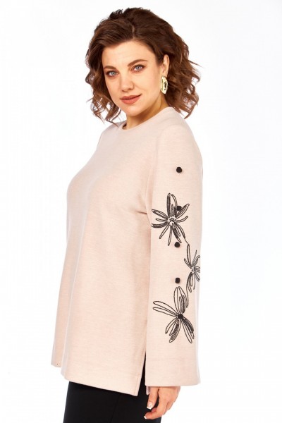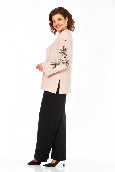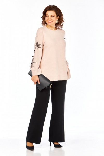 Комплект брючный двухпредметный, состоит из джемпера и брюк. Джемпер выполнен из трикотажного полотна. Перед цельнокроеный. Рукава втачные декорированы вышивками и помпонами. В боковых швах обработаны разрезы. Брюки прямые из трикотажного полотна. Пояс на резинке. В брюках обработаны карманы.