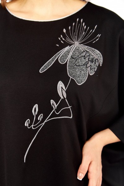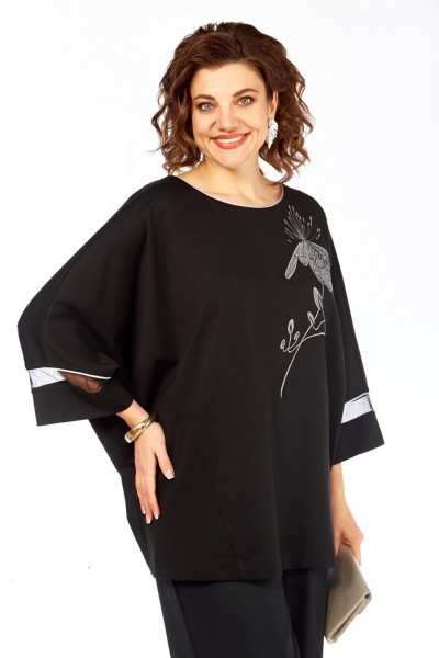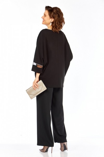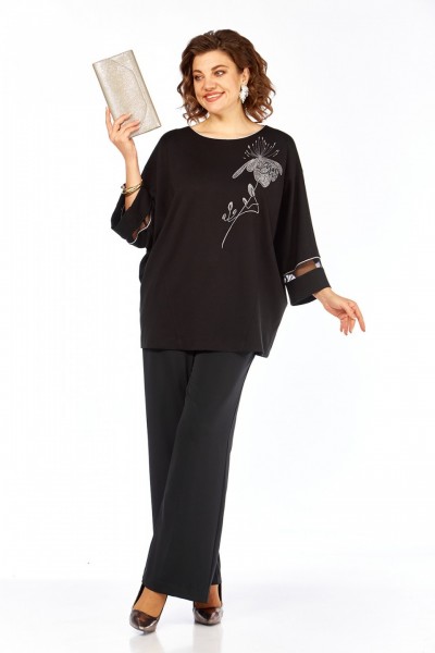 Комплект брючный, нарядный, состоит из джемпера и брюк. Джемпер женский свободного кроя. Перед разрезной, с дизайнерской вышивкой — аппликацией. Горловина круглой формы с кантом. Рукава цельнокроеные со вставками из сетки и с кантом. Брюки прямого силуэта из костюмно — плательной ткани. Пояс притачной на резинке. В брюках обработаны карманы.