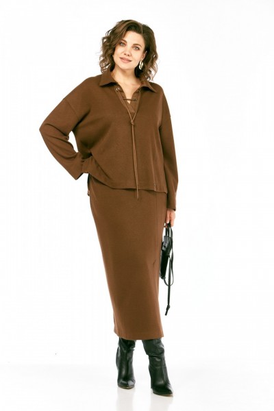 Костюм женский, юбочный, изготовлен из трикотажного полотна, состоит из джемпера и юбки. Джемпер свободного кроя. Горловина оформлена отложным воротником на стойке и планками, декорированными люверсами, с протянутым в них шнуром. Рукава спущенные, длинные. Низ изделия разной длины, в боковых швах разрезы. Кокетка спинки, планки и воротник джемпера выполнены из отделочной ткани. Юбка с цельнокроенным поясом на резинке. На передней части шов, внизу обработана шлица. Юбка на подкладке.