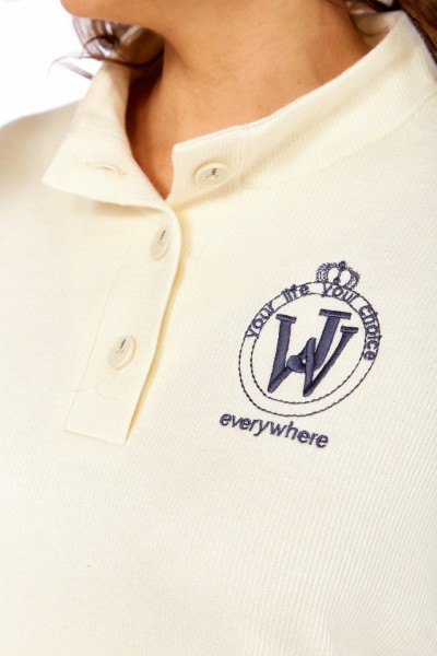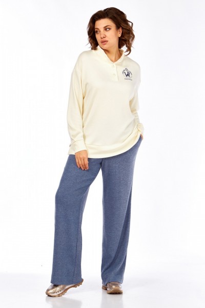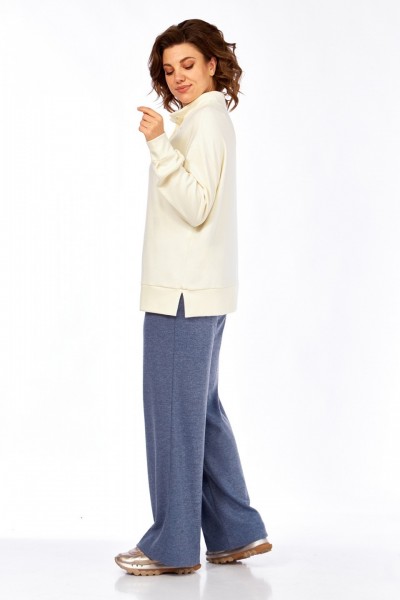 Комплект женский брючный двухпредметный, состоит из джемпера и брюк. Джемпер свободного кроя, изготовлен из трикотажного полотна. Горловина обработана воротником-стойкой и планками с застежкой на петли и пуговицы. Рукава спущенные, с манжетами. По низ изделия притачная деталь с разрезами по бокам. На полочке джемпера расположена вышивка. Брюки прямого силуэта, выполнены из трикотажного полотна. В передних деталях брюк обработаны карманы. Пояс притачной на эластичной тесьме.