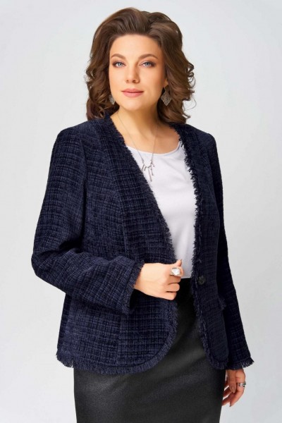 Жакет выполнен из твидовой ткани на подкладке полуприлегающего силуэта. Застежка в жакете однобортная на пуговицу, по полочке - рельефы, карман-обманка в виде настроченной трепки, по спинке рельефы. По краю борта и низа жакета вставлена трепка, рукав втачной двухшовный, по низу рукава вставлена трепка.
