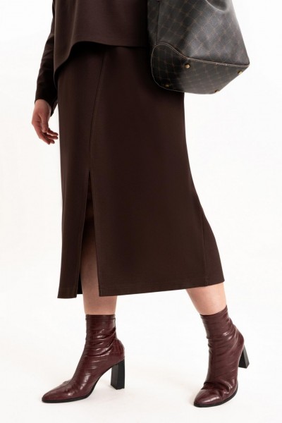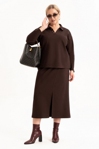 Стильный женский трикотажный костюм с юбкой станет настоящей находкой для каждой современной модницы. Удобный и практичный женский костюм оверсайз прекрасно подходит для любого типа фигуры, помогая выгодно скрыть недостатки и подчеркнуть достоинства. Приталенный силуэт трикотажной юбки с высокой посадкой, а также свободный крой свитшота сделает образ лаконичным, поможет всегда оставаться в тренде. Неповторимый стиль и удивительный комфорт умело сочетаются в этом женском костюме с юбкой. Женский костюм отлично подходит для повседневной носки, а также для более формальных ситуаций. Этот костюм идеально подходит как для офисной среды, так и для обеденного свидания или других повседневных мероприятий. Вы сможете легко создать разнообразные образы, изменяя аксессуары и обувь. В нем каждая сможет чувствовать себя комфортно. Удобный крой позволит не сковывать движения, при этом полноценно облегая силуэт женской фигуры. Костюм выполнен с учетом последних модных тенденций, что обеспечивает его стильный дизайн. Высококачественный трикотажный материал »лакоста», используемый при создании, придает костюму особую мягкость и удобство во время носки. Юбка с разрезом по цетру переднего полотнища и боковыми карманами добавляет нотку женственности и элегантности к образу. Горловина свитшота V-образная с обработанными планками и воротником, с боковыми разрезами и пришивным декором. Свитшот оверсайз отличается не только свободным кроем, но и имеет спущенную линию рукава, выгодно скрывая мельчайшие недостатки женской фигуры.