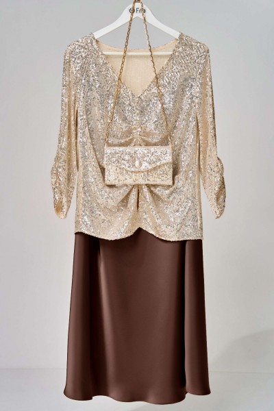 ""Зария"" — сияющий акцент вашего новогоднего образа. Блузка, расшитая пайетками, ловит свет при каждом движении, а сатиновая юбка добавляет торжественности и утончённости. Идеальный дуэт для праздников, когда хочется блистать. Сумка-клатч ""Зария"" — это не просто аксессуар, а настоящее украшение вашего образа.