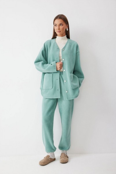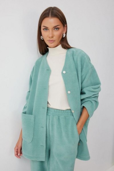 Жакет прямого силуэта с фигурным низом из трикотажного полотна. Горловина округлая, по центру застежка на кнопки. Рукав со спущенной линией плеча. По переду накладные карманы. Жакет без подкладки. Обращаем ваше внимание, что фурнитура может отличаться от фото.