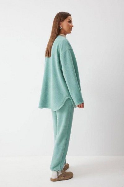 Брюки прямого силуэта из комфортного трикотажного полотна. По верху брюк притачной пояс на резинке с декоративной нашивкой. На передних половинках обработаны карманы. Ширина брюк по низу регулируется за счет эластичной тесьмы и фиксаторов.