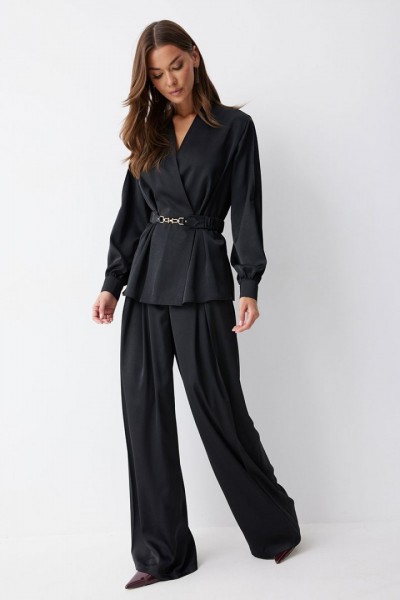 Брюки прямого силуэта расширенные книзу из струящейся ткани. По верху брюк притачной пояс с застежкой на петли и пуговицы. На передних половинках обработана застежка молния в среднем шве. На передних половинках карманы и декоративные складки. По поясу задних половинок брюк резинка и вытачки.