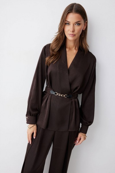 Блузка полуприлегающего силуэта расширенная книзу из струящейся ткани. Рукав втачной, с разрезом в области плеча, по низу манжета с застежкой на петли и пуговицы. Блузка отрезная по линии талии. По переду от подреза вверх и вниз декоративные складки. На спинке в подрез вставлена резинка. В комплект входит съемный ремень. Обращаем ваше внимание, что фурнитура может отличаться от фото.