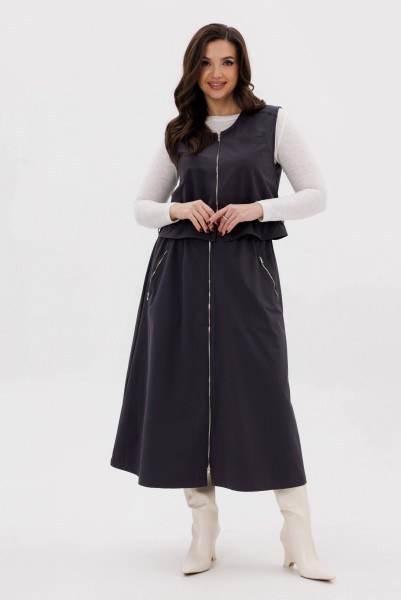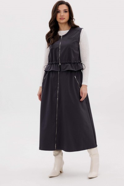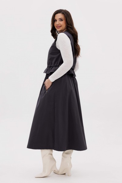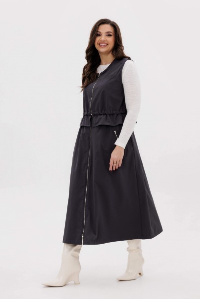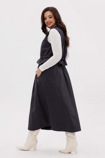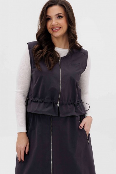 Жилет свободный с центральной застёжкой на тесьму-молнию, кулисой чуть ниже линии талии, неширокой баской. Полочки с отрезной кокеткой и прорезным карманом с листочкой. Кулиса с эластичным шнуром и фиксаторами.