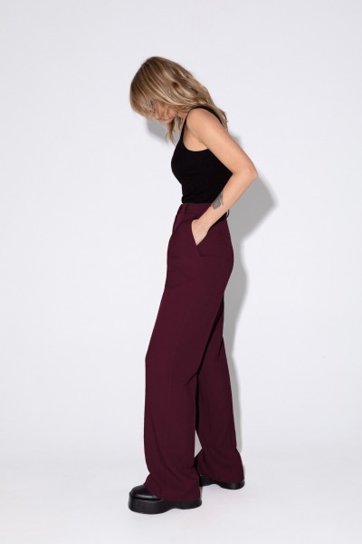 Брюки с высокой посадкой на притачном поясе со шлевками, застежка на молнию и пуговицу, боковые карманы, передние половины с заутюженными стрелками и двумя небольшими складками.
