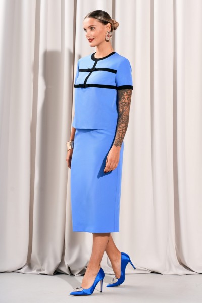 Блуза с округлым вырезом горловины. Перед с декоративными отрезными деталями и бантами контрастного цвета. Спинка с потайной молнией в среднем шве. Рукава втачные с контрастной отделочной деталью по низу.