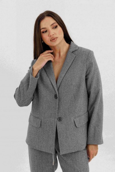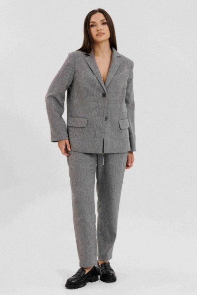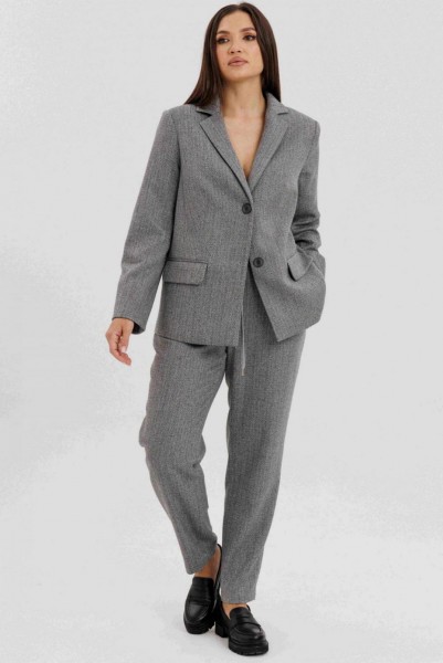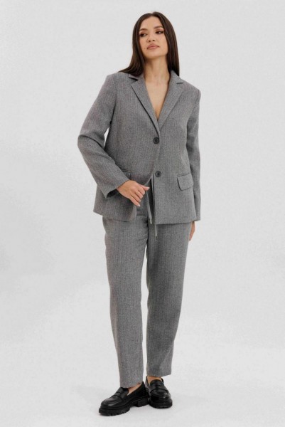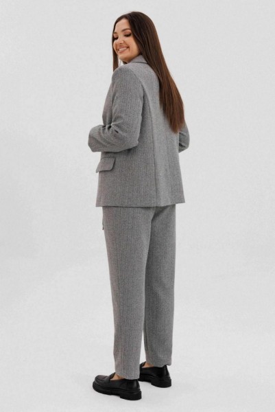 Комплект 2-х предметный. Силуэт свободный, слегка упрямлённый, покрой-втачной, воротник классический английский, линия борта фигурная, застёжка на две петли и пуговицы. Полочка с отрезным бочком, нагрудной вытачкой и прорезным карманом с клапаном. Спинка со средним швом и талиевой вытачкой. Рукав двухшовный с отлетной шлицей и отделочными пуговицами. Брюки свободные, на эластичном поясе с люверсами и отделочным шнуром. Передние половинки с боковыми накладными карманами.