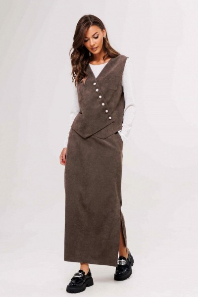 Жилет полуприлегающего силуэта с асимметричной застёжкой, фигурной линией низа и регулирующийся кулисе по спинке. Полочки с отрезным бочком и нагрудными вытачками, спинки - с центральным швом, отрезным бочком и регулирующийся кулисой с фиксаторами.