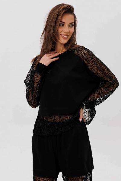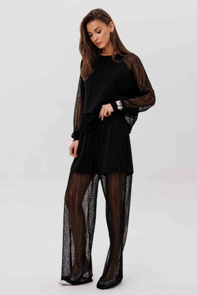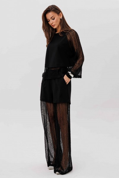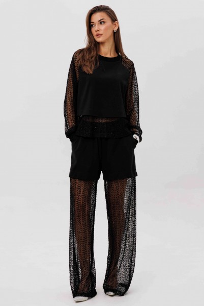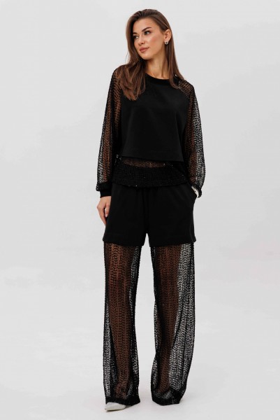 Современный брючный комплект, который создаёт эффект многослойности и лёгкого сияния. Джемпер выполнен из мягкого, комфортного вискозного полотна с нейлоном и дополнен воздушными рукавами из мерцающей сетки с россыпью микропайетки. Брюки на удобном эластичном поясе имеют прозрачную нижнюю часть в тон — подвижную, блестящую и подчёркивающую силуэт. Стильное решение для тех, кто ценит тренды и оригинальное звучание образа.